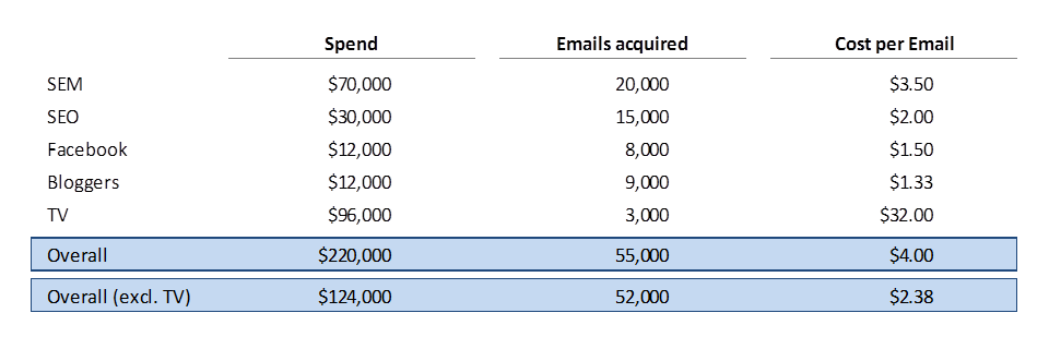 In November, 2013 the ABC Company spent an average of $4.00 to acquire a registered user. Excluding TV, almost 95% of registered users were acquired through channels that yielded a cost of under $2.38 per registration. The action indicated by the analysis is to re-allocate the TV budget to other sources, particularly Facebook advertising and bloggers. ABC did re-allocate spend and brought their average cost of acquiring an email down to $2.50.