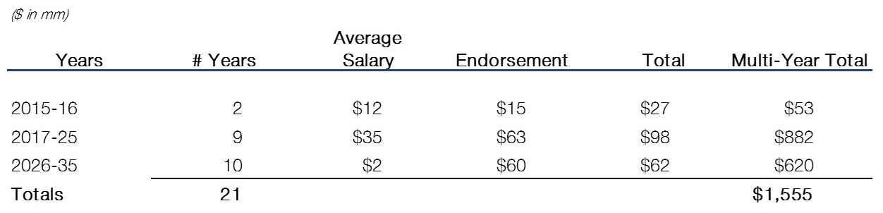 The current highest earner of endorsements in the NBA is LeBron James at about $44 million per year (Kevin Durant is second at $35 million). The highest contract in the league is Kobe Bryant at about $23 million per year (and had been $30 million previously) with the 10 highest players in the league making an average of over $21 million. Given the new TV contract scheduled to go into effect in the 2016-2017 season, it’s been projected that the cap will increase from about $63 million today to $90 million in 2017 and be nearly $140 million by 2025 (10 years from now, at age 37, Curry should still be playing). Let’s make the following assumptions: