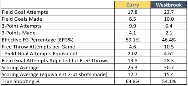 Westbrook’s shooting percentage of 42.0% is lower than the worst shooting team in the league, Memphis at 43.2%, and, as mentioned is the lowest of the 7 people on his team that play the most minutes. Curry has a 5.5% higher percentage than Westbrook. But the difference in their effectiveness is even greater as Curry makes far more three point shots. Effective shooting percentage adjusts for 3 point shots made by considering them equal to 1½ two point shots. Curry’s effective shooting percentage is 59.1% and Westbrook’s is 46.4%, an extraordinary difference. However, Westbrook gets to the foul line more often and “true shooting percent” takes that into account by assuming about 2.3 foul shots have replaced one field goal attempt (2.3 is used rather than 2.0 to account for 3 point plays and being fouled on a 3-point shot). Using the “true shooting percentage” brings Westbrook’s efficiency slightly closer to Curry’s, but it is still nearly 10% below Curry (see table 2). What this means is very simple – if Curry took as many shots as Westbrook he would score far more. In fact, at his efficiency level he would average 36.1 points per game versus Westbrook’s 30.7. While it is difficult to prove this, I believe if Westbrook reduced his number of shots Oklahoma City would score more points, as other players on his team, with a higher shooting percentage, would have the opportunity to shoot more. And he might be able to boost his efficiency as a shooter by eliminating some ill-advised shots.
