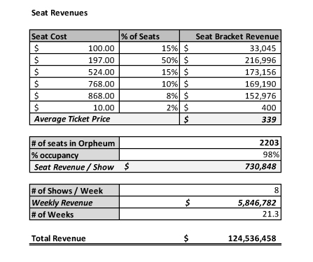 Currently Hamilton has a second permanent show in Chicago, a national touring company in San Francisco (until August when it’s supposed to move to LA) and has announced a second touring company that will begin the tour in Seattle in early 2018 before moving to Las Vegas and Cleveland and other stops. I believe it will also have a fifth company in London and a sixth in Asia by late 2018 or early 2019. Surprisingly, the touring companies can, in some cities, generate more weekly revenue than the Broadway company due to larger venues. Table 1 shows an estimate of the revenue per performance in the sold out San Francisco venue, the Orpheum Theater which has a capacity 2203 versus the Broadway capacity (Richard Rogers Theater) of 1319.