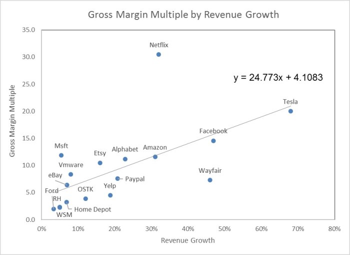 So, when evaluating a round of financing for a pre-profit company the gross margin multiple as it relates to growth should be considered. For example, while there are many other factors to consider, the formula implies that a 40% revenue growth company should have a valuation of about 14X trailing gross margin dollars. Typically, I would expect that an earlier stage company’s mature gross margin percent would likely increase. But they also should receive some discount from this analysis as its risk profile is higher than the public companies shown here.
