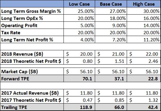Table 1 provides the above as the base case for long term operating profit. To provide perspective on the Tesla opportunity, Table 1 also shows a low-end case (25% GM and 20% operating cost) and a high-end profit case (30% GM and 16% operating cost). Recall, theoretic earnings are derived from applying the mature operating profit level to trailing and to forward revenue. For calculating theoretic earnings, I will ignore interest payments and net tax loss carry forwards as they appear to be a wash over the next 5 years. Finally, to derive the Theoretic Net Earnings Percent a potential mature tax rate needs to be applied. I am using 20% for each model case which gives little credit for tax optimization techniques that could be deployed. That would make theoretic earnings for 2017 and 2018 $0.85 billion and $1.51 billion, respectively and leads to: