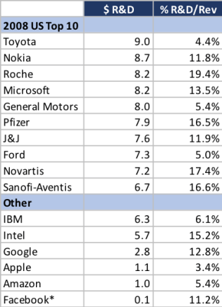 Table 1: Top 10 (and a few more) U.S. R&D Spenders in 2018 ($Bn)