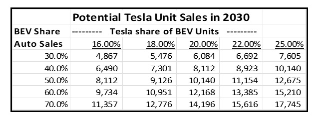 In 2022 Tesla sold over 1.3 million BEV autos which was 17.1% of the BEV market. That is far from the full story as they did not participate in several large categories of vehicles: pickup trucks, low-cost autos, and sports cars. Their share was over 30% in the categories they did participate in. I believe that by 2030 Tesla will have added all three of these categories to its lineup. If we take the middle row and column of the above chart: BEVs have 50% market share and Tesla sells 20% of BEVs (which is 1/3 share lower than they currently have in categories in which they participate). That would mean Tesla will sell 10.14 million vehicles in 2030. If they did, the company would have an 8-year CAGR of 29%. This is well below the 50% growth they are tracking towards this year but of course the law of large numbers predicts a decline in high growth rates.